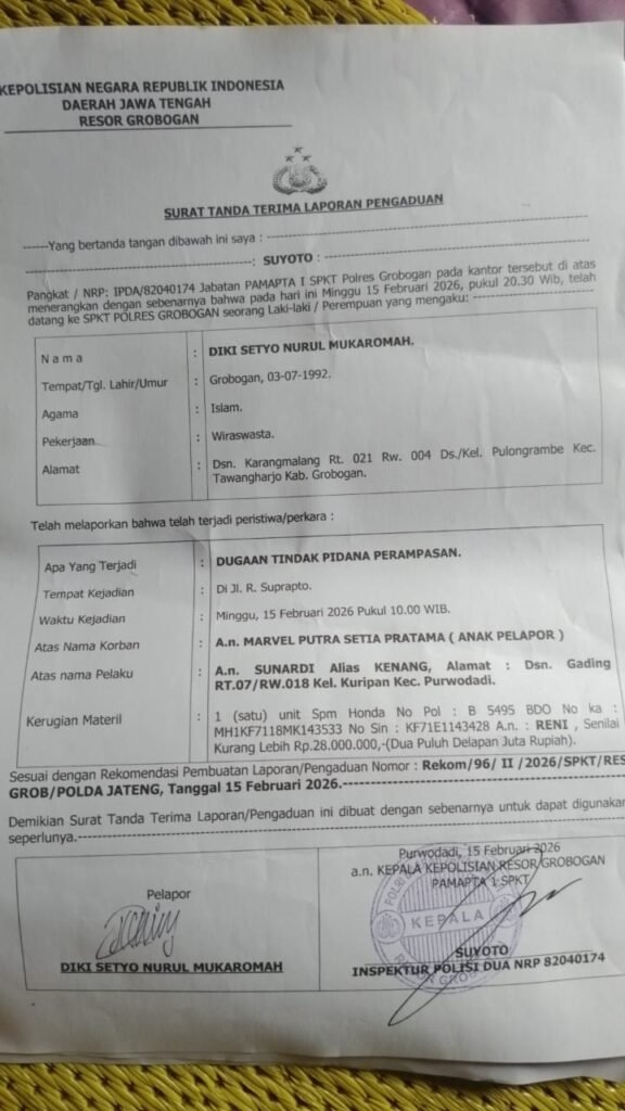 JejakNusantara.net – GROBOGAN, Senin 02-03-2026, Diduga merampas sepeda motor tanpa prosedur, Dept Collector di grobogan di laporkan ke polisi, kejadian yang menimpa pemuda bernama Marvel tersebut terjadi di Jalan R Suprapto- Purwodadi Kabupaten Grobogan, pada Minggu (15/02) sekira pukul 10.00 WIB, Dan kini korban sudah melapor ke Polres setempat.